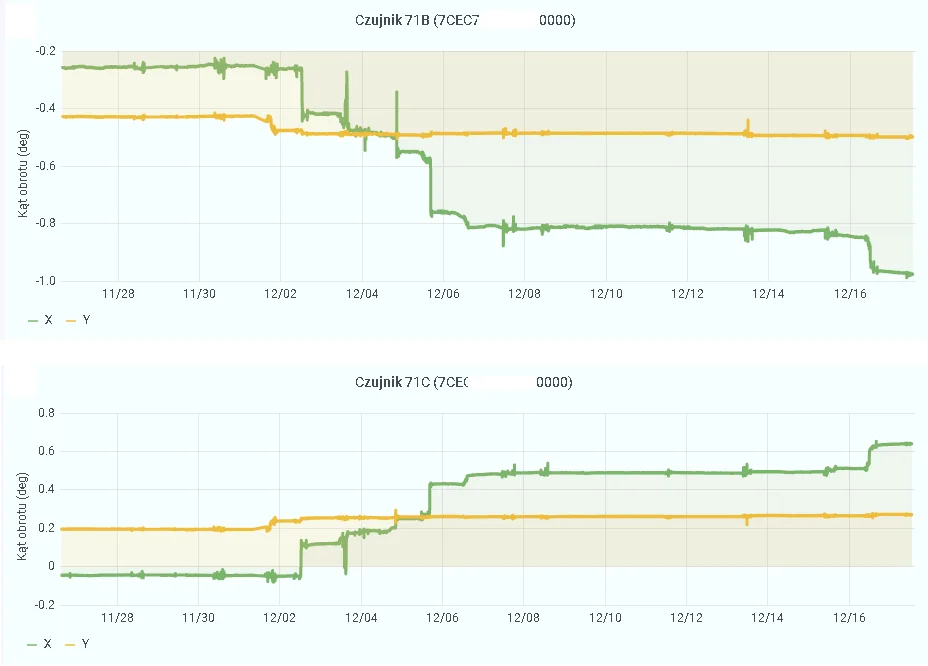 Inclinometer sensors allow to control the inclination of the device from the vertical. Depending on the type, they can measure in one or two directions. However, it is always a deviation from a vertical line treated as an absolute or relative value. Thanks to the use of horizontal pads in the described case, each sensor could be fully used and simultaneously measured the tilt in two planes. Therefore the use of four sensors on the uncovered part of the pipe actually allowed to control the behavior of the element by measuring eight inclination values (four in each support section).