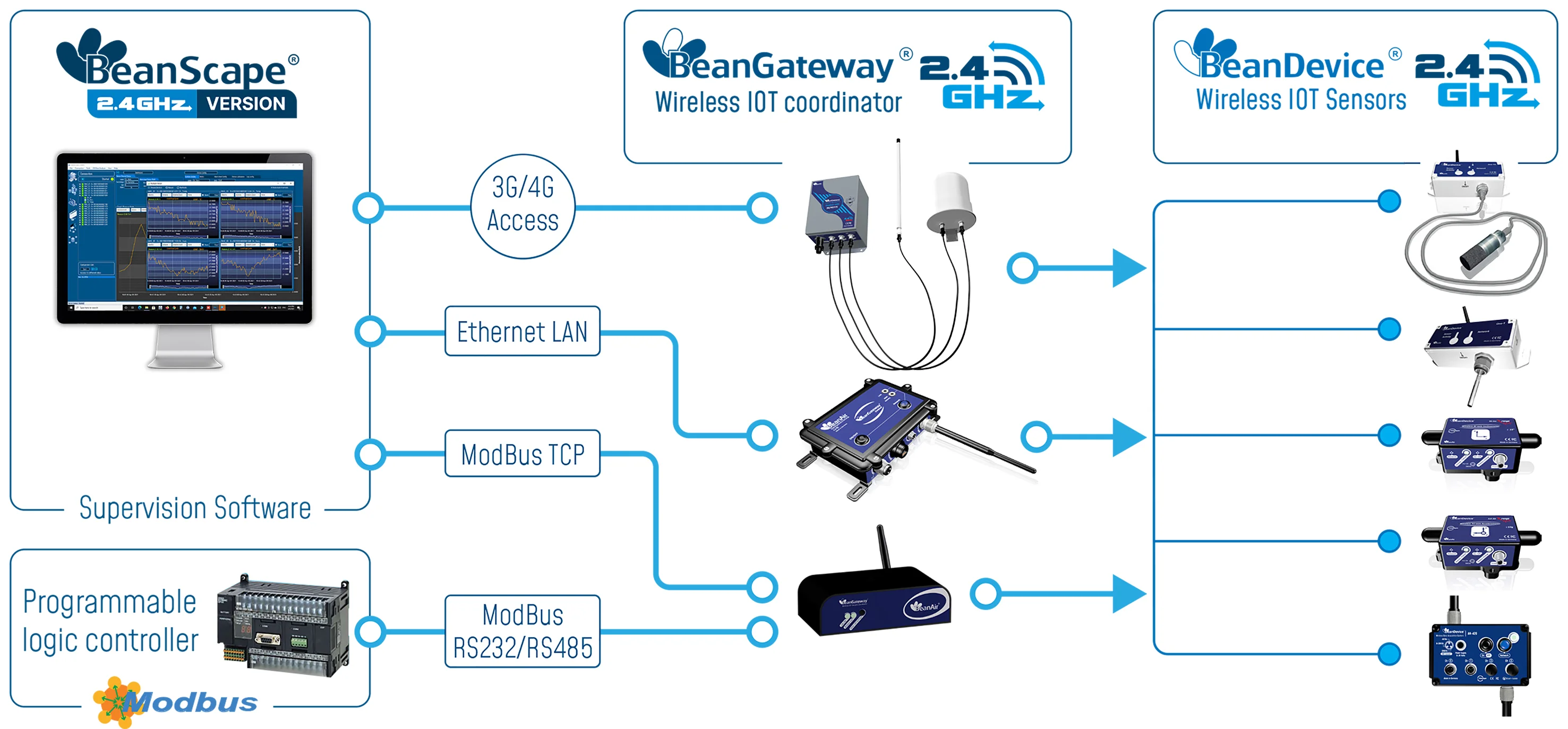 Wireless range in Line-of- Sight (L.O.S.) and Non Line-of-Sight (NLOS) | 15km max in Line of Sight (+22dBm transmission, 5dBi Antenna, Gateway installed on mast 25 meter Height) 1-2 km in Urban environment (density of Berlin city center) Ground to underground 200-500 meters max | With High Gain Antenna : 100-200m (L.O.S), 40-80m (N.L.O.S.) With Integarted Radome Antenna : 50-100m (L.O.S), 20-50m (N.L.O.S.) In both case Radio Range can be extended by adding Wifi Bridge/Repeater | High Gain Antenna : 400m max (L.O.S, Antenna Pointing to Vertical position, BeanGateway Installed on a mast 10 meters height), 60-120m (N.L.O.S.) Integrated Radome Antenna : 150m max (L.O.S, Antenna Pointing to Vertical position, BeanGateway Installed on a mast 10 meters height), 30-60m (N.L.O.S.) |