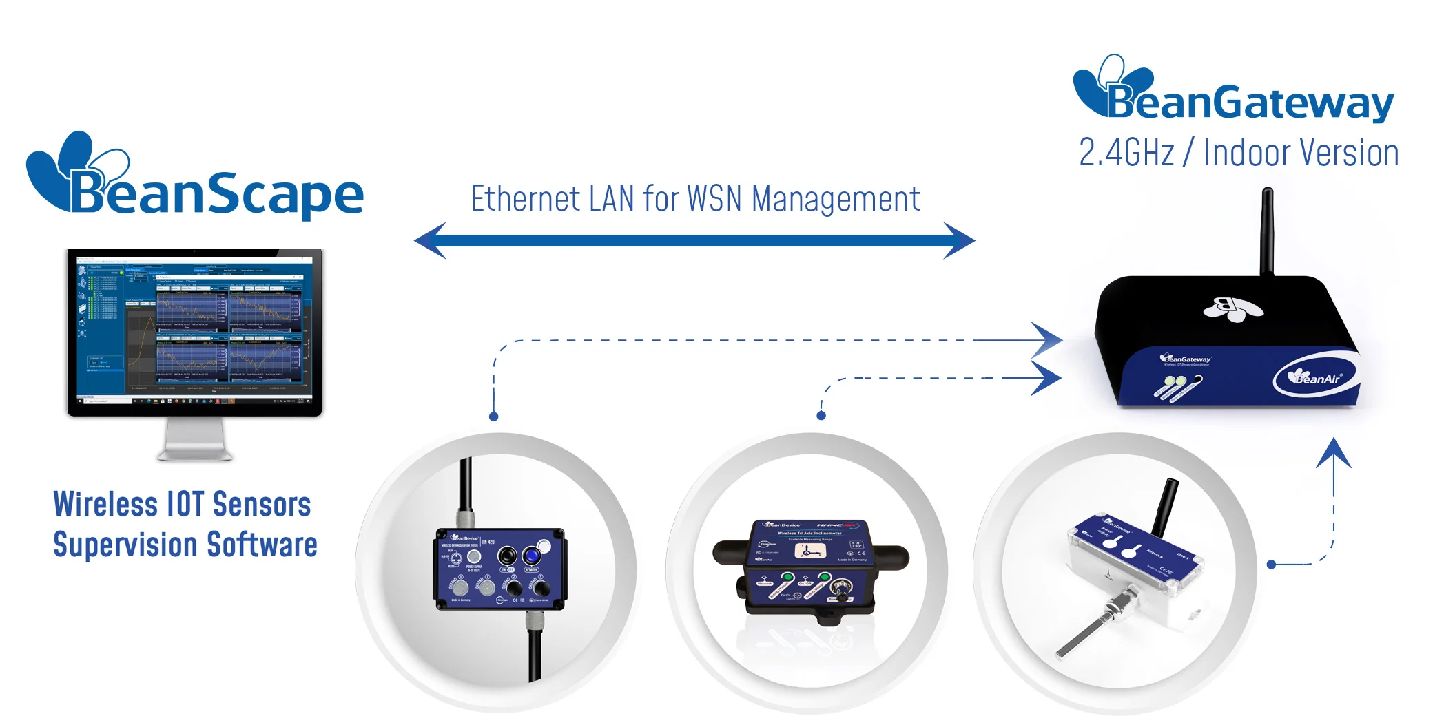 Experience effortless management of your Beanair® wireless sensor network with the BeanGateway® Ethernet (Indoor version). This intelligent gateway efficiently orchestrates communication and data flow for all your BeanDevice® sensors, ensuring reliability and performance. It secures external network access with a highly robust authentication process, protecting your critical data. By handling data conversion, compression, and IP connectivity, the BeanGateway® reduces the complexity and associated costs of your overall system. Reliability is paramount. The BeanGateway® Ethernet operates with an external DC 8-28V power supply and features an integrated rechargeable battery for uninterruptible power. This built-in UPS functionality guarantees continuous operation of your wireless sensor network and Ethernet LAN, even during sudden power interruptions. Deploy with confidence in remote sites thanks to our powerful Wireless Sensor Network (WSN) mapping management, offering: • Automatic Data Security: Network configurations are automatically backed up to both flash memory and the BeanScape® software. • Effortless Scalability: Easily export and import network configurations to streamline deployment across multiple BeanGateway® units. | |||