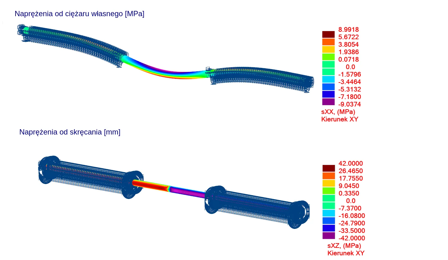 A significant elemet of further analysis was the behavior of the element, taking into account the parameters of the subsoil in the support zone for both output values (according to geotechnical research), as well as in the event of a lowering of the water level ground. The gas pipeline then began to work as an element interrupting the depression cone generated by the use of well points. The graphs (Photo 11) show the change in behavior of the gas pipeline which was initially loaded only with its own weight, and then with its own weight under changing ground conditions.