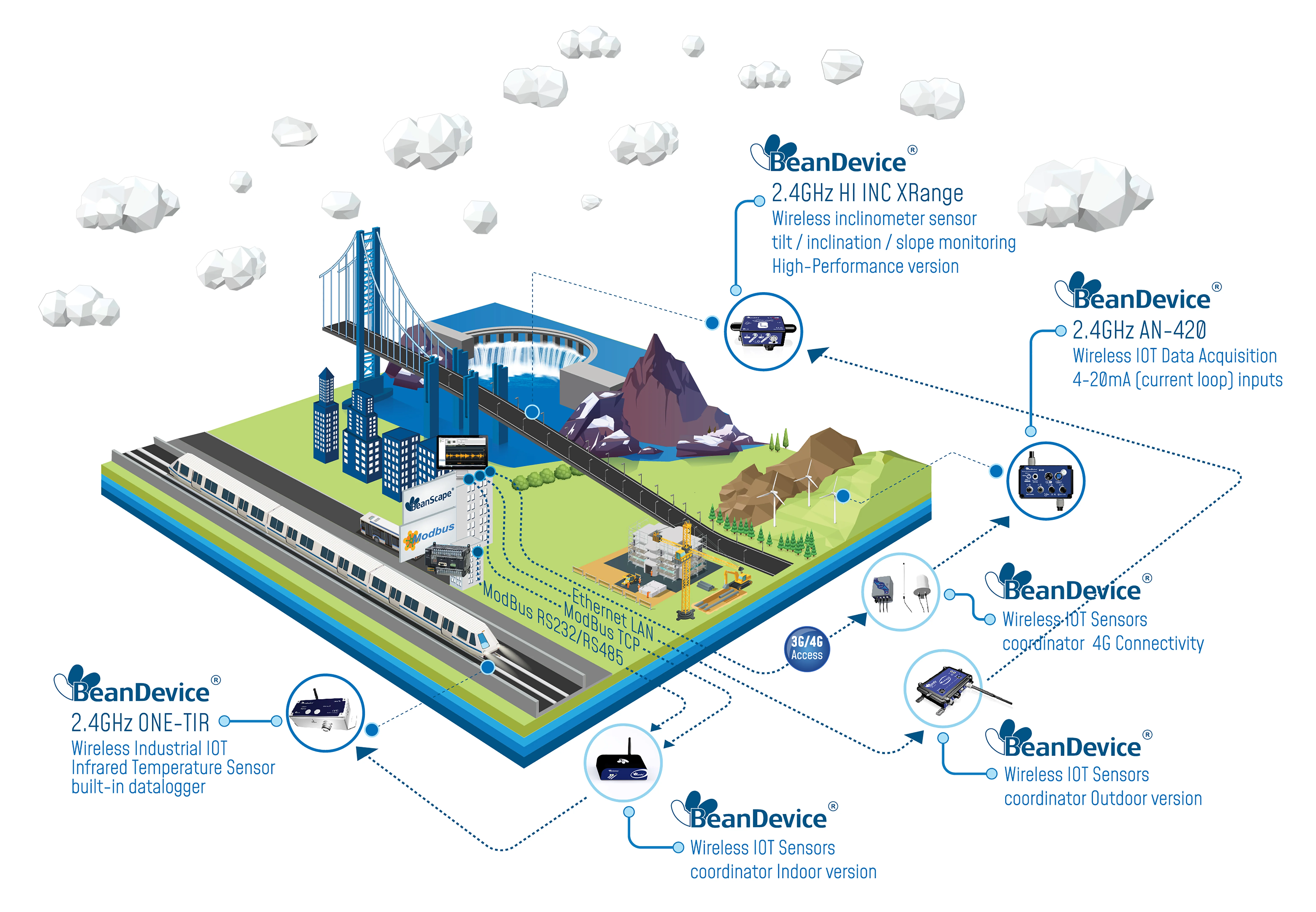 Wireless range in Line-of- Sight (L.O.S.) and Non Line-of-Sight (NLOS) | 15km max in Line of Sight (+22dBm transmission, 5dBi Antenna, Gateway installed on mast 25 meter Height) 1-2 km in Urban environment (density of Berlin city center) Ground to underground 200-500 meters max | With High Gain Antenna : 100-200m (L.O.S), 40-80m (N.L.O.S.) With Integarted Radome Antenna : 50-100m (L.O.S), 20-50m (N.L.O.S.) In both case Radio Range can be extended by adding Wifi Bridge/Repeater | High Gain Antenna : 400m max (L.O.S, Antenna Pointing to Vertical position, BeanGateway Installed on a mast 10 meters height), 60-120m (N.L.O.S.) Integrated Radome Antenna : 150m max (L.O.S, Antenna Pointing to Vertical position, BeanGateway Installed on a mast 10 meters height), 30-60m (N.L.O.S.) |