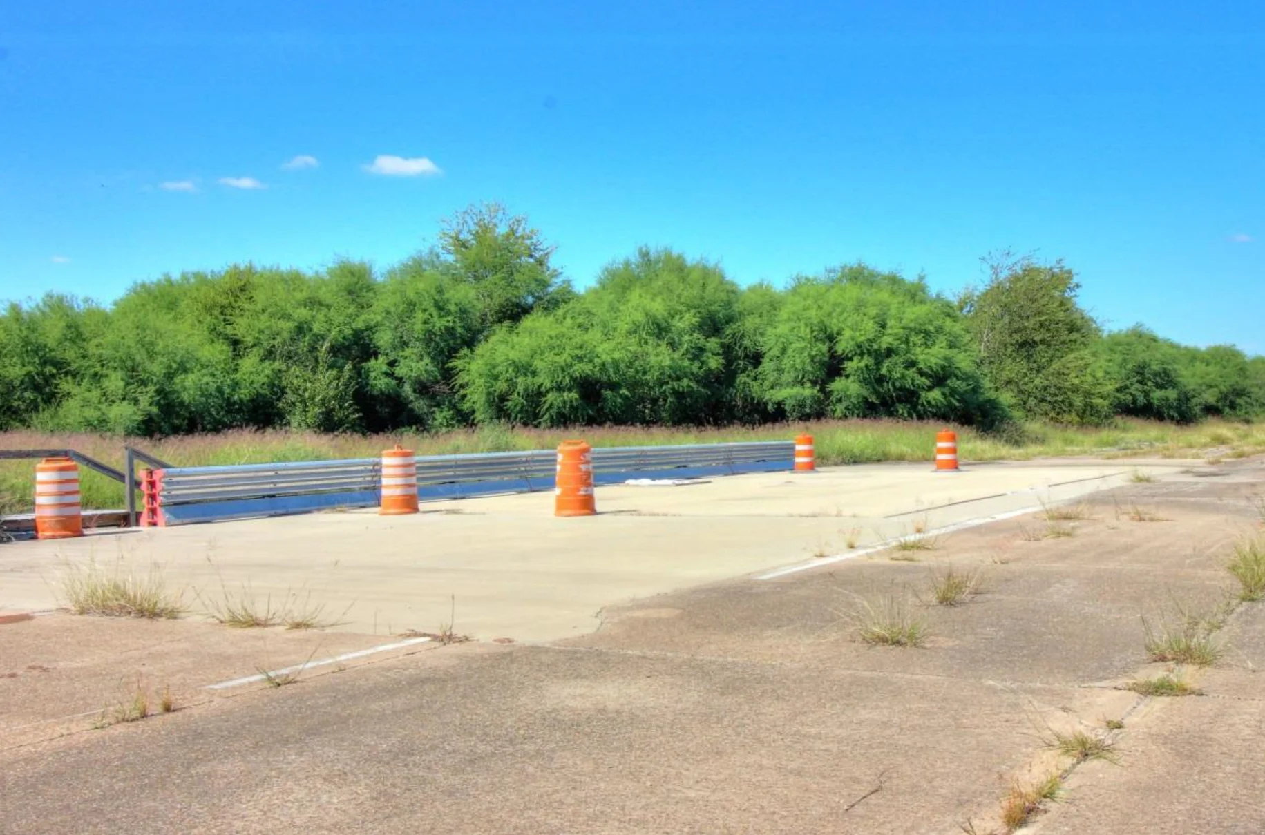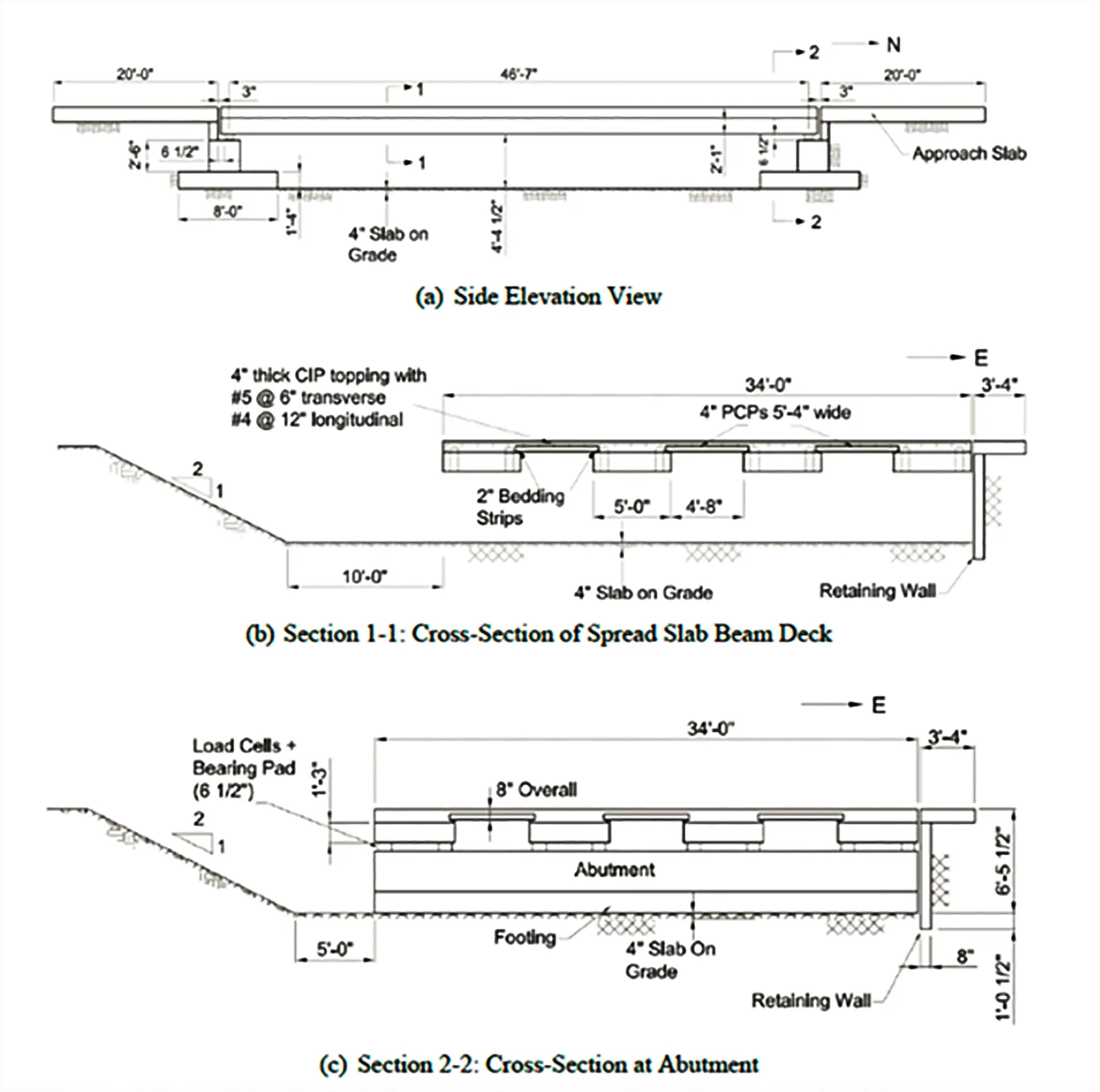 The test structure is a simply supported bridge which was designed and built at the edge of a runway located at the Texas A&M University Riverside Campus. It has a 46 ft 7 in. span length (from center to center of the bearing pads) and an overall width of 34 ft .The bridge superstructure has four slab beam girders spaced at 4 ft 8 in. clear spacing with prestressed concrete panels (PCPs) between the slab beams as stay-in-place (SIP) forms. The slab beam girders are standard TxDOT 5SB15 slab beams. The 4 in. thick PCPsare 8 ft long and have an overall width of 5 ft 4 in. The cast-in-place (CIP) deck thickness varies slightly along the length to accommodate the camber of the prestressed slab beams.