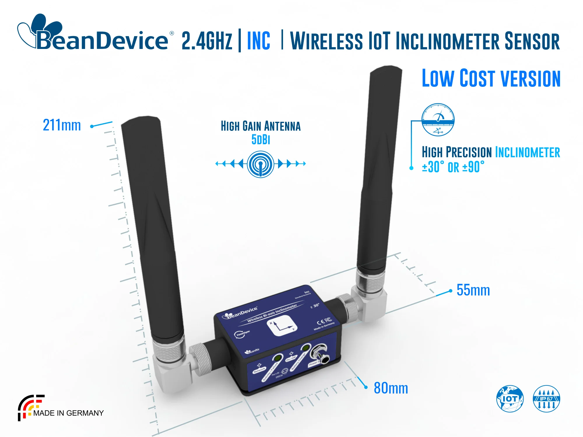 Available in several versions (±30°or ±90° bi-axis), the BeanDevice® 2.4GHz INC is a wireless inclinometer with integrated data logger.