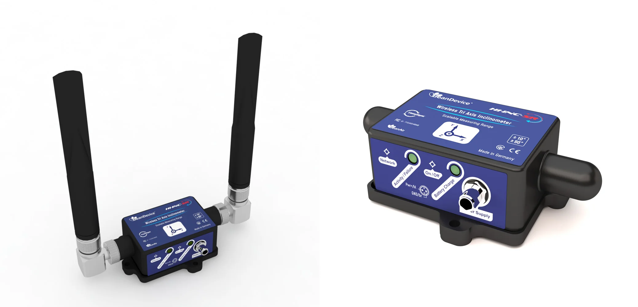 The BeanDevice® HI-INC SR is a high-performance wireless trix-axis inclinometer designed with a scalable measuring range (±10° and ±90°, with automatic range adjustment depending on the application). It provides exceptional precision, offering accuracy of up to ±0.01° for the ±10° range and ±0.02° for the ±90° range. Additionally, it incorporates a built-in temperature sensor, located at the device’s base, to monitor the temperature of your equipment or structure. | |||