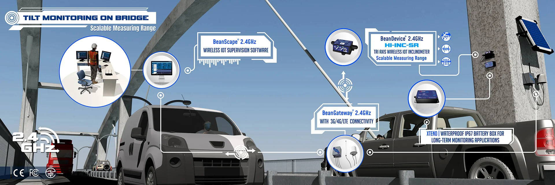 Our antenna solutions are designed to provide reliable wireless connectivity across a variety of operational environments:• Radome Antenna:This compact antenna is perfectly suited for applications with space constraints, offering robust performance without requiring a large footprint.-Typical Wireless Range:150m (Line of Sight*) | 30-60m (Non-Line-of-Sight)• High-Gain Antenna:Optimized for maximum reach, this antenna is the premier choice for long-distance data transmission, ensuring signal integrity over extended areas.-Typical Wireless Range:400m (Line of Sight*) | 60-120m (Non-Line-of-Sight)*Line-of-Sight (LOS) range is based on field tests conducted with the device antenna oriented vertically and a BeanGateway® installed on a 10-meter mast utilizing a 9dBi antenna.